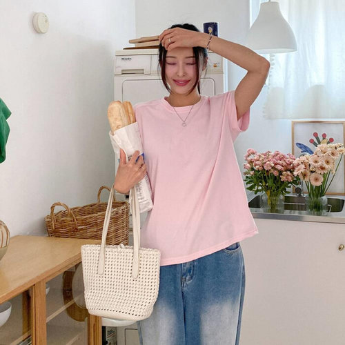 [다잇템_패션]여성 무지컬러 U넥 실버참 면원단 반팔티