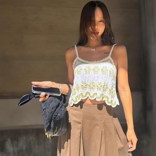 [신상오픈런]여성 여름 물결 패턴 크롭 뜨개 꽃무늬 나시 탑
