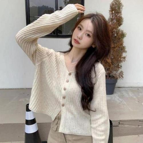 [셀러허브_여성트랜드패션]ONM 여성 미니멀 골지 세미 크롭 긴팔 니트 가디건