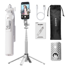 바우아토 미니 초경량 광각 촬영 모드 원터치 사각 거치 블루투스 셀카봉 삼각대 140cm, 화이트, 1개