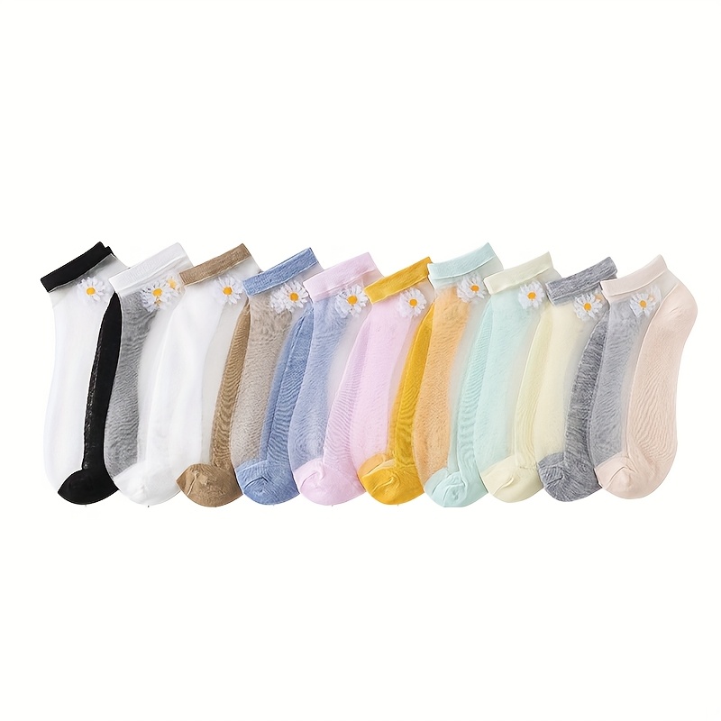 TEMU 여성 데일리 발목 양말 10켤레 세트 - 부드러운 플로럴 자수가 있는 통기성 좋은 얇은 여름 양말, And 혼방, 골지 커프스, 귀여운 양말.
