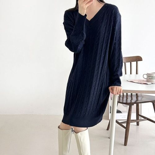 에르디테 / 비스코스 꽈배기 케이블 니트 브이넥 롱 미디 원피스