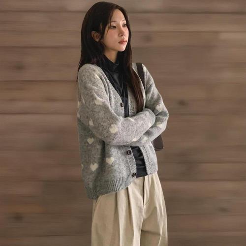 [미라클세븐]여성 앙고라 하트 디자인 루즈핏 브이넥 니트 카디건