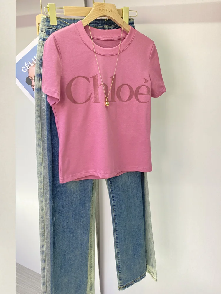 시크한 레터 프린트 반팔 티셔츠 여성용 예쁜 슬리밍 탑 여름 패션 핑크 스트레이트 컷 레귤러 핏 라운드 넥