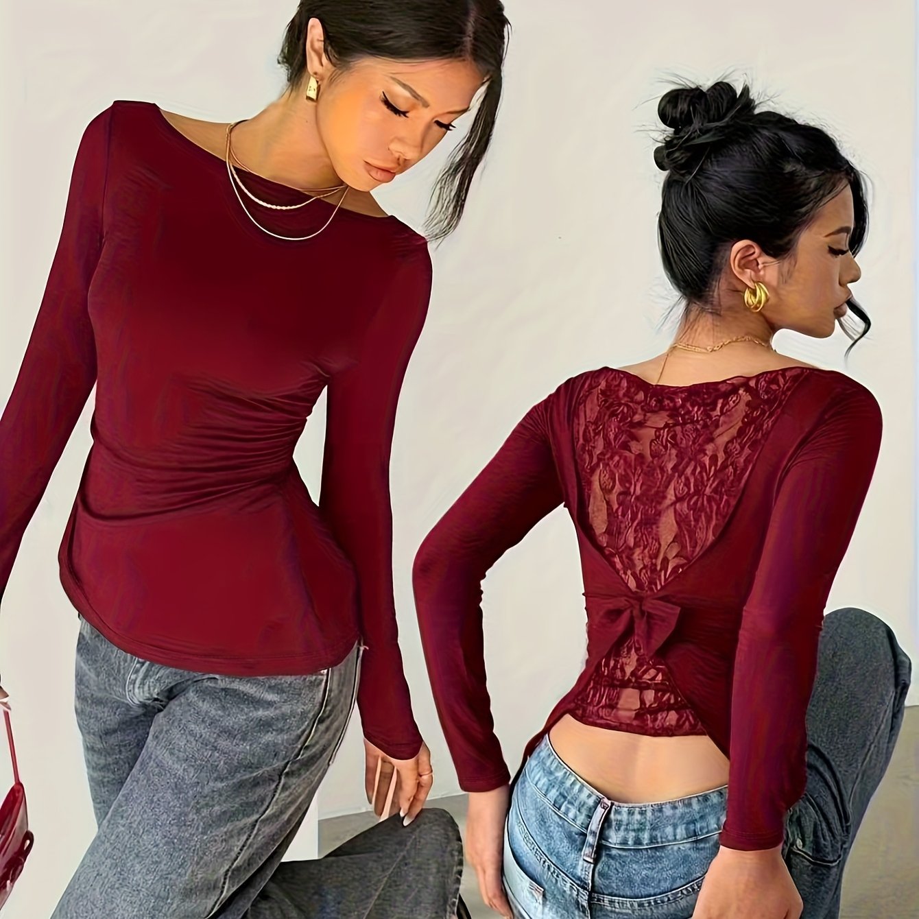 TEMU 여성용 섹시 백리스 홀아웃 긴팔 탑 | 단색, 가을/겨울 시즌, 백 보우 디테일