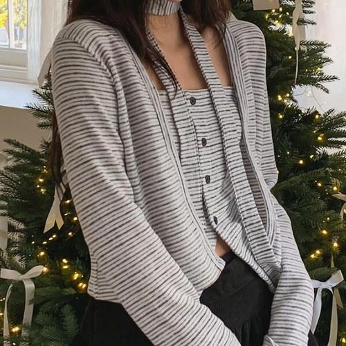 [디자이너몰]여성 슬림핏 스트라이프 초커 나시 가디건 세트