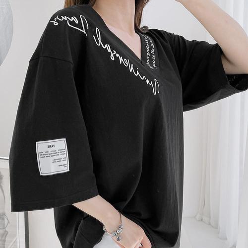 [민트위니]영문브이박스 오버핏 빅사이즈 면소재 브이넥 프린트 티셔츠 반팔