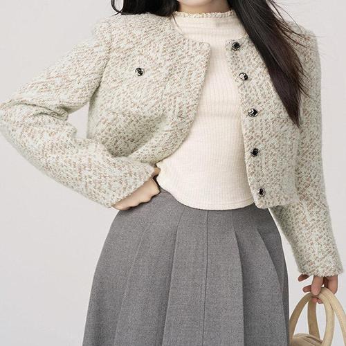 [엘린무드]라엘 울 트위드 도톰 슬림 노카라 금장 버튼 미니 데이트 키작녀 연말 파티 민트 고퀄 자켓 원..