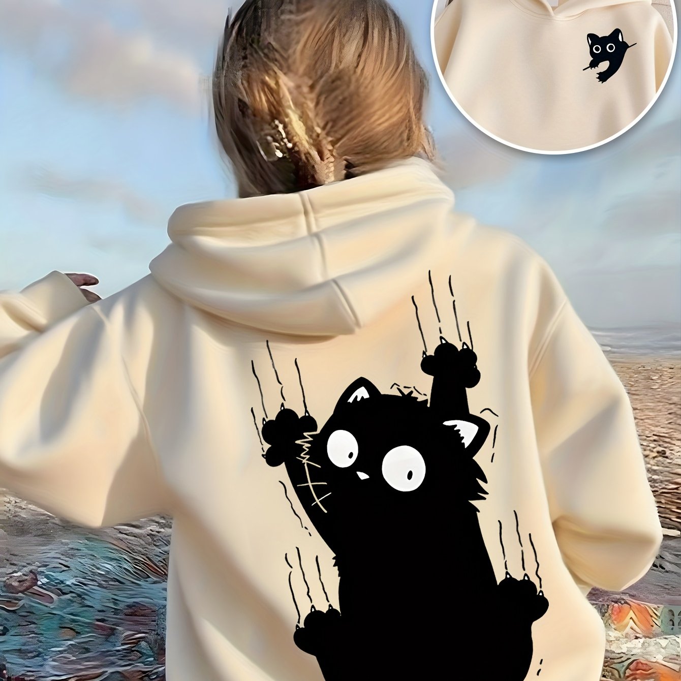 TEMU 여아용 귀여운 고양이 프린트 후드 스웨트셔츠 - 오버사이즈 루즈핏 후디, 블랙 & 화이트 새끼고양이 백 디자인, 베이지 스웨터, 봄/가을, 아웃도어 & 캐주얼 웨어, 세탁기 사용 가능 (건조기 금지)