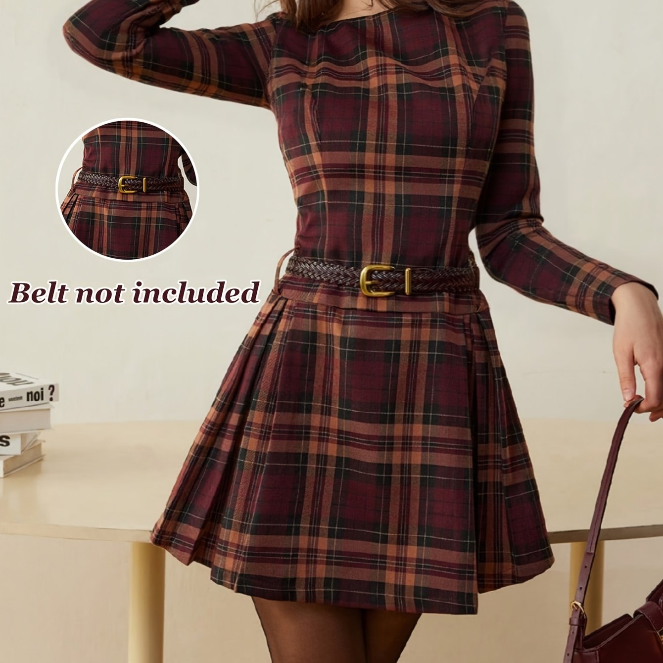 TEMU 여성용 우아한 체크무늬 A라인 숏 드레스 () - 풀길이 지퍼백 숏 헴 드레스, 기계 세탁 가능 라운드넥, 크리스마스 파티, 캐주얼 웨어 - 사계절 아웃핏