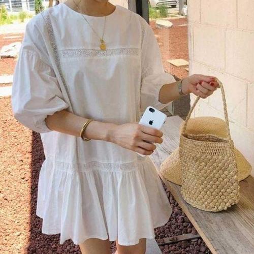 [에이치플러스몰]자수 레이스 캐주얼 화이트 원피스 필수템 밑단 프릴