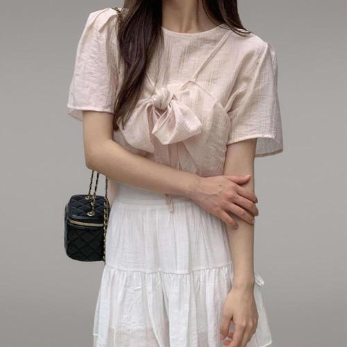 |KHH3ECE|여성 시스루 레이어드 반팔 블라우스 리본 뷔스티에
