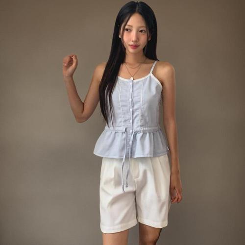 나시 뷔스티에 블라우스 리본 프릴 플레어 휴양 GWM 슬리브리스