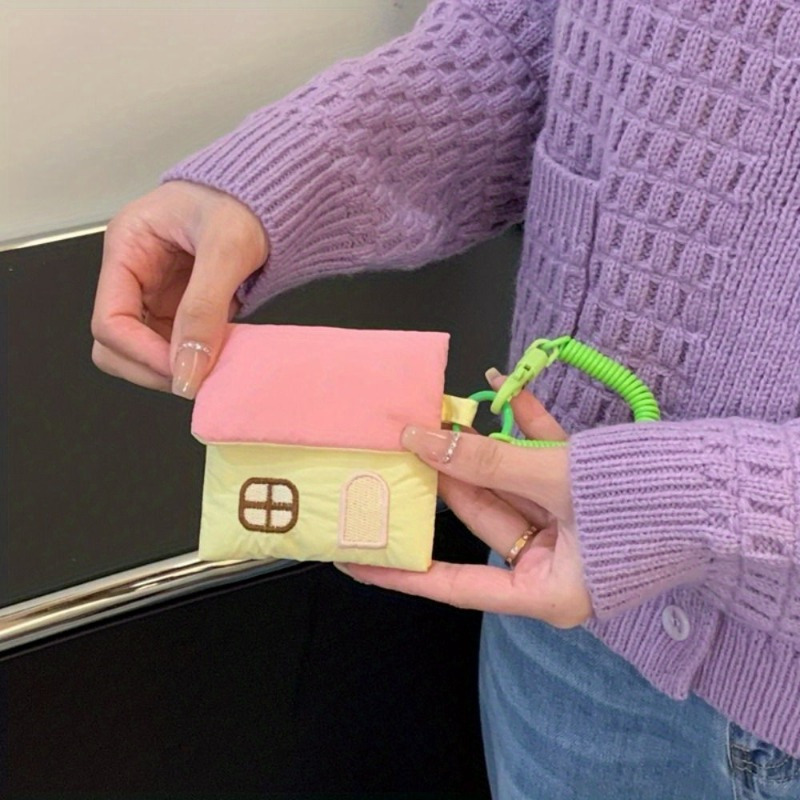TEMU 귀여운 집 모양 키체인 파우치 - 로프 클로저가 있는 미니 폴리에스터 보관 가방, 여성용 패스텔 컬러 컴팩트 펀칭 펜던트, 이어폰, 동전 및 열쇠 정리용, 스타일리시한 지갑 참 액세서리, 장난기 넘치는 디자인 | 내구성 있는 잠금장치