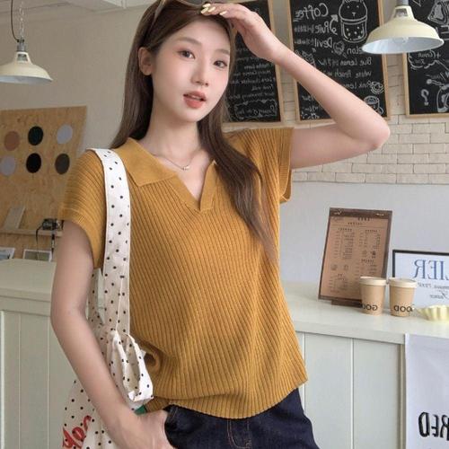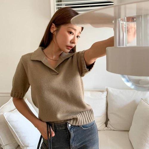 여성반팔니트 오픈카라 애스리 넥니트 여름니트