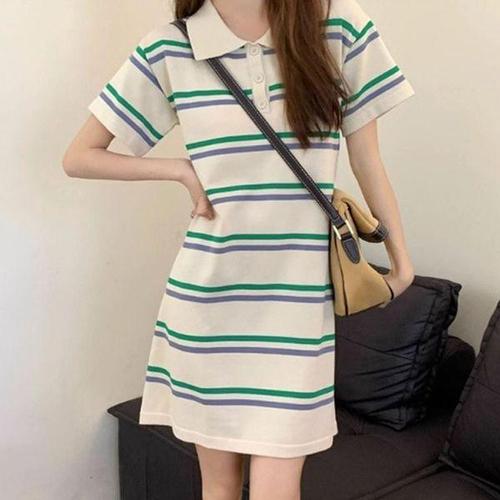 [에이치플러스몰]여자 스트라이프 카라 원피스 여름 반팔니트