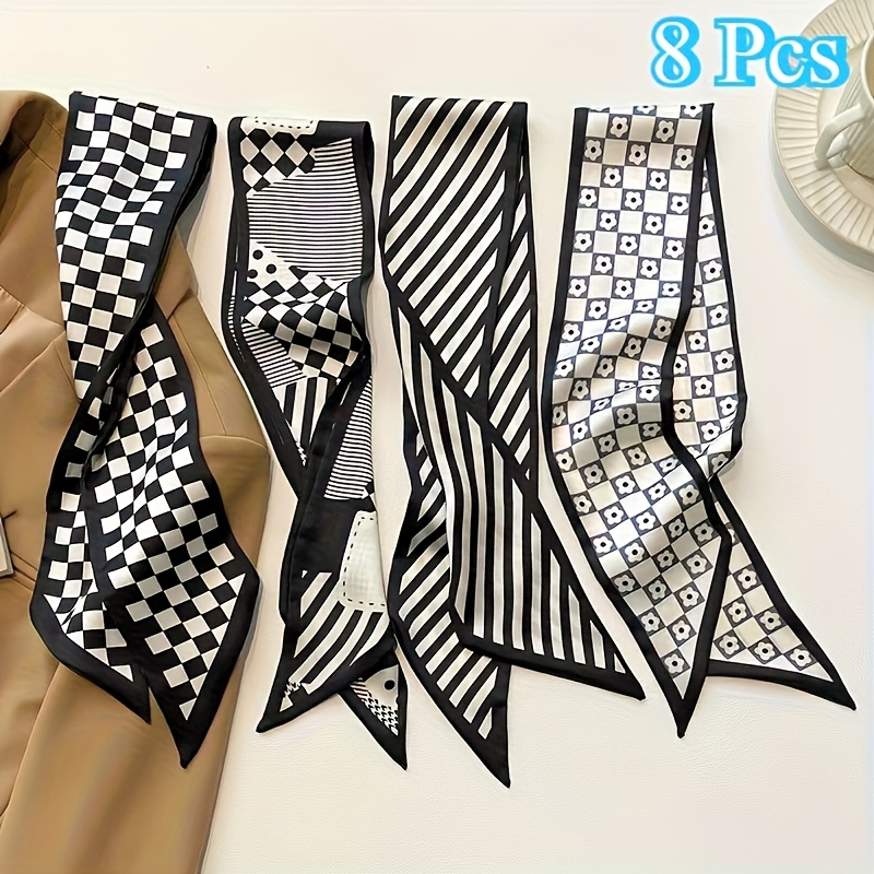 TEMU 8개/1세트 프렌치 스타일 분위기 나는 슬림 롱 스카프 블랙 체크무늬 양면 헤어밴드 머리끈 리본 우아한 멀티 넥스카프