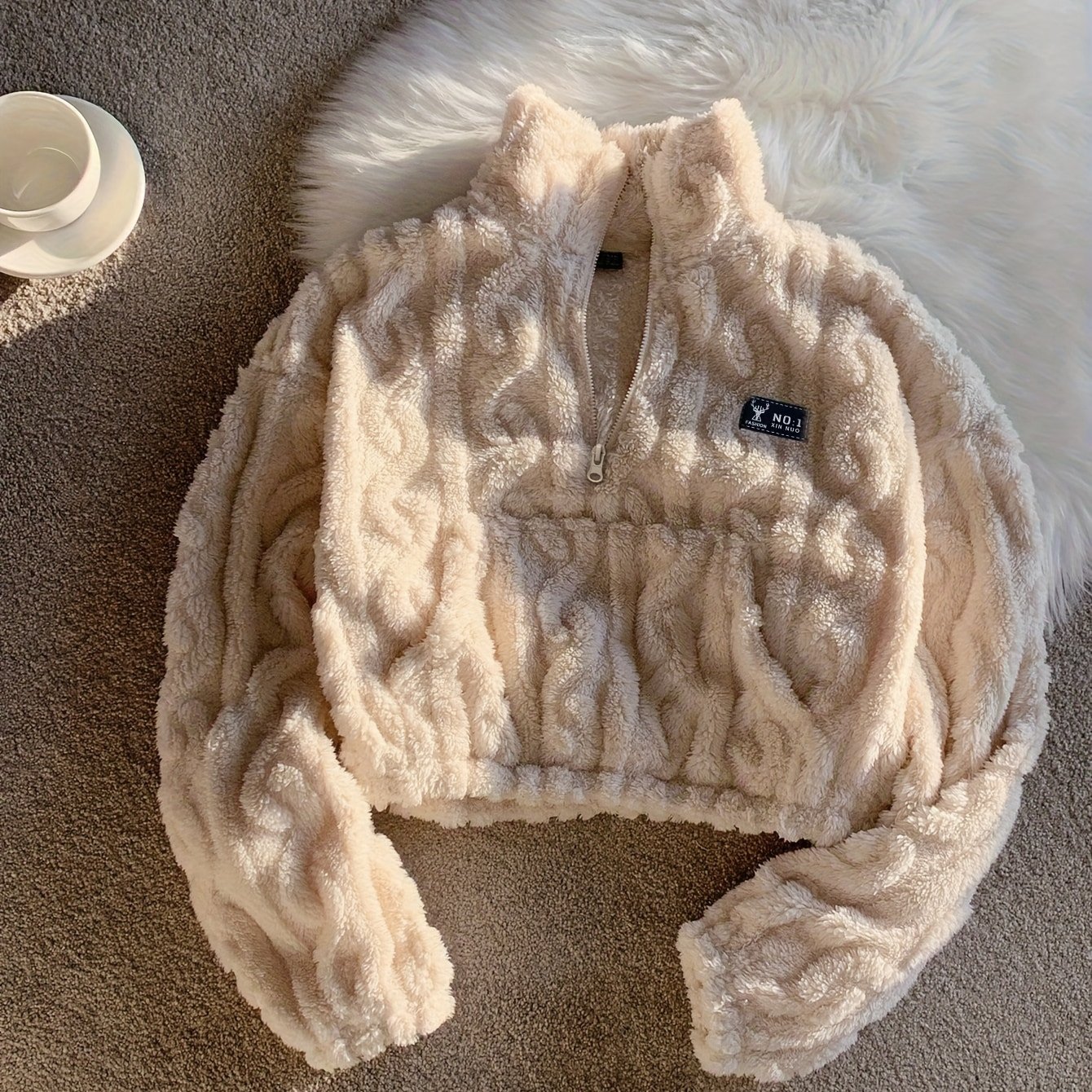 TEMU 여성용 플러시 인조 칼라 숏 스웨터 자켓 - 베이지 겨울 코트, 지퍼 클로저, 라운드 넥 & 풀 지퍼 프론트, 세탁기 사용 가능한 올시즌 아우터 (캐주얼에서 드레시까지) - 노스트레치 따뜻한