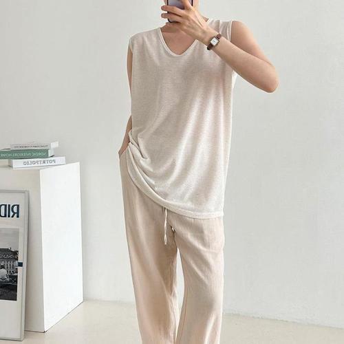 [다잇템]여자 민무늬 V넥 튜닉 박스핏 찰랑나시 민소매 (10363701A)