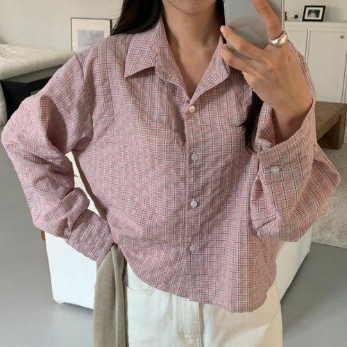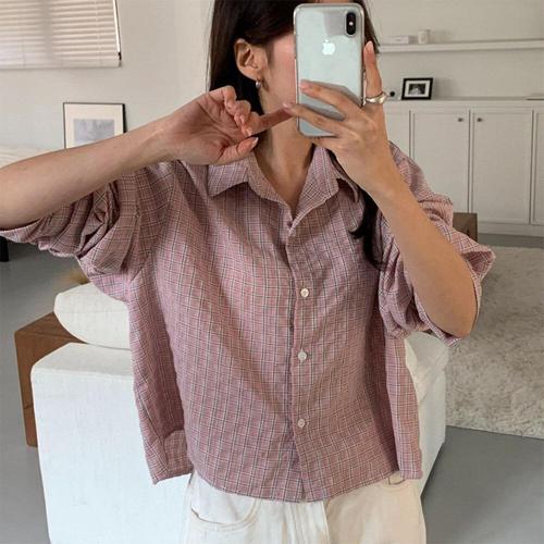 [신상오픈런]여성용 봄 크롭 셔츠 체크 패턴 박스핏 개강 스타일 코튼 블라우스