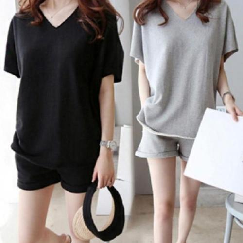 [다잇템]여자 3컬러 반소매 하프팬츠 투피스 V넥 세트 (10636555A)