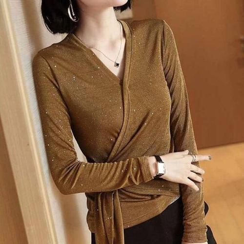 TKX 여성용 빅사이즈 긴팔 반짝이 장식 V넥 레이스 루즈핏 티셔츠 기본티 K51