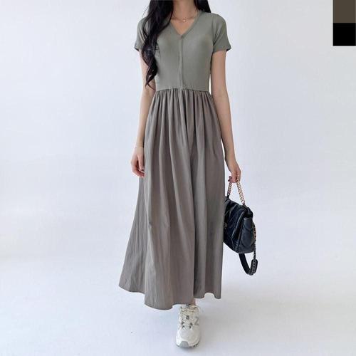GSS ND63 브이넥 플레어 맥시 드레스 데일리 반팔 롱 원피스 WFKQI8D