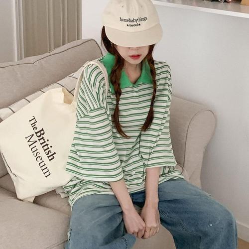 [유야]여성 배색 카라 스트라이프 반팔 롱 티셔츠 -FTS1102- 봄 여름