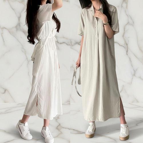 |CCO59E2|여성용 자연스러운 루즈핏 카라 반팔 원피스 봄 여름용