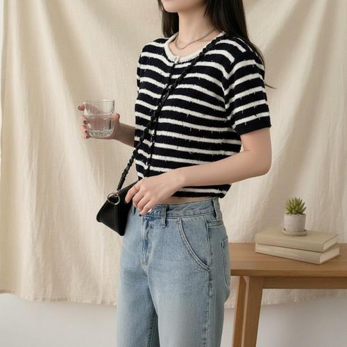[옷자락] 여성 스트라이프 부클 반팔 니트 가디건 봄여름용