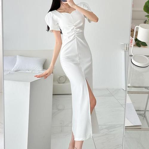 [다잇템]여자 반소매 잔주름 벌룬 클럽룩 슬릿 롱원피스 (10892678A)