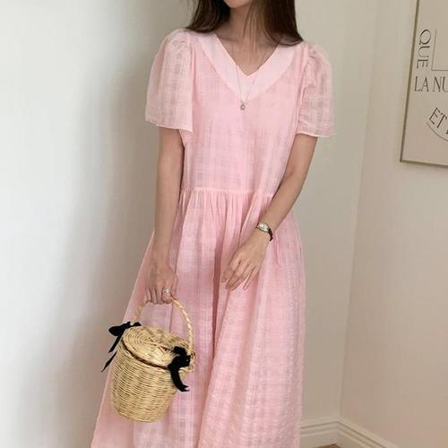 [다잇템]여자 격자 V넥 반소매 잔주름 SS 롱원피스 (10234209A)