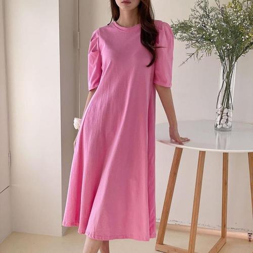 [다잇템]여자 벌룬반팔 분홍 후레아 등원룩 롱원피스 (10143684A)