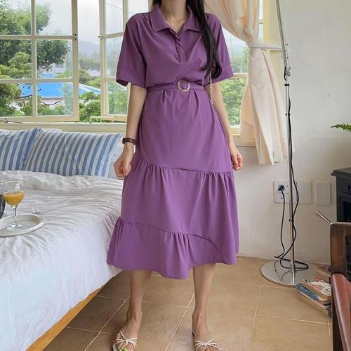 여성 라운드넥 벨티드 반팔 롱원피스