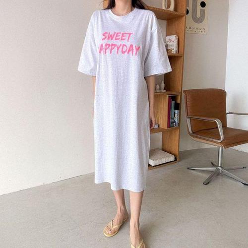 [에이치플러스몰]빅사이즈 인기 여성 레터링 롱 감성 트임 반팔 원피스