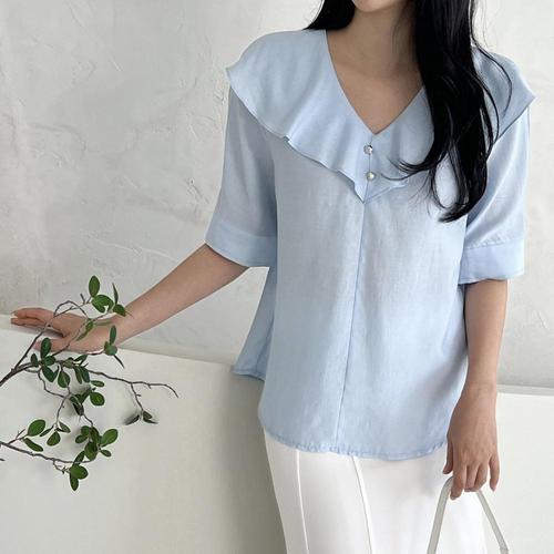 국산 여성 프릴 V넥 정장 출근룩 반팔 블라우스 REI-WBL-5173-소라