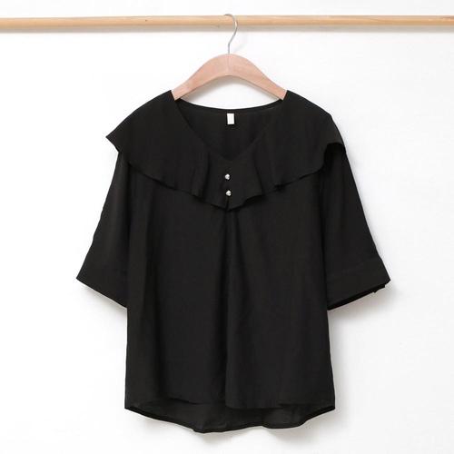 국산 여성 프릴 V넥 정장 출근룩 반팔 블라우스 REI-WBL-5173-블랙
