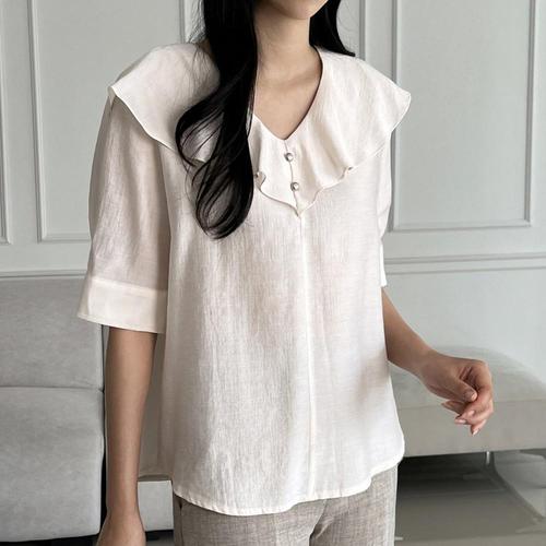 국산 여성 프릴 V넥 정장 출근룩 반팔 블라우스 REI-WBL-5173-크림
