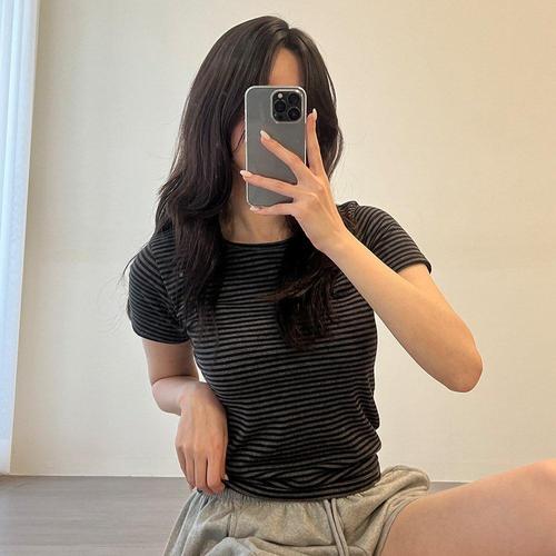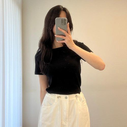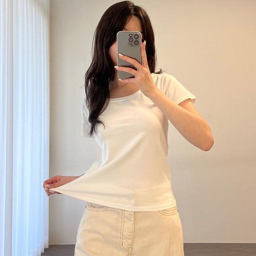 [1+1] 여자 U넥 단가라 반소매 레이온 슬림핏 티셔츠