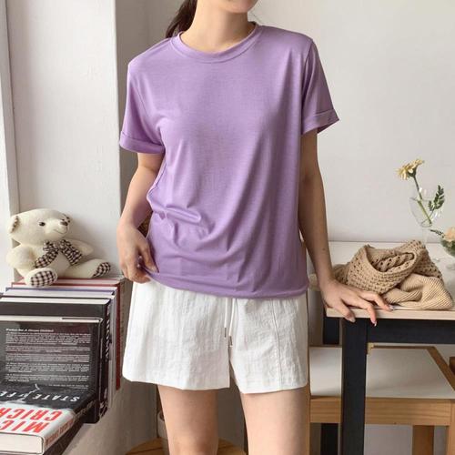 [1+1] 여자 소프트핏 레이온 소매롤업 민무늬 반팔티