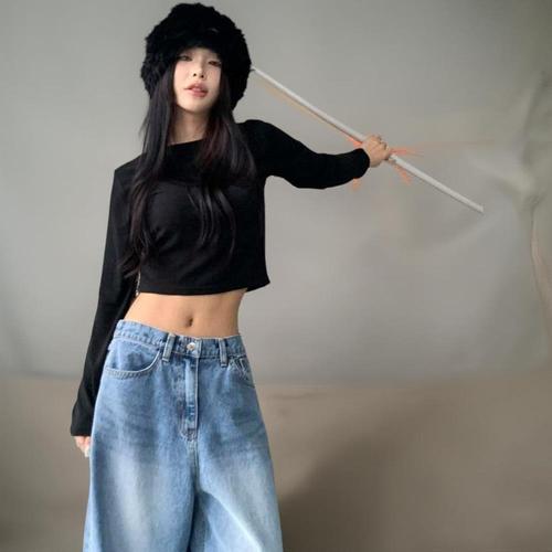 [엄지척]긴팔 딥 티셔츠 배꼽티 크롭 여성 슬림핏 골지 U넥_19646301_667501
