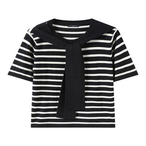 [나인식스뉴욕]숄 세트 스트라이프 배색 라운드 반팔 니트 (NQ2KT002L0)
