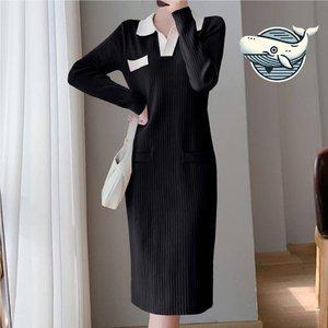 추동용 여성 레이스 배색 진주 장식 니트 원피스 데일리 캐주얼 롱 원피스 우아한 스웨터
