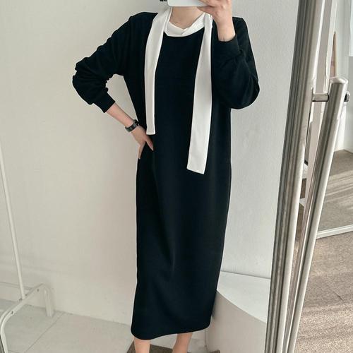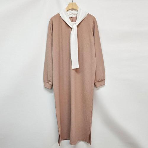 OPC016 A라인 1컬러 롱원피스 베이직 리본 데일리 의류 배색 여성