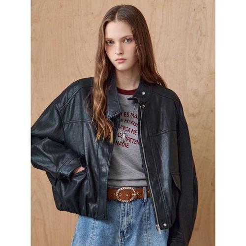 [마쟈]페이크 레더 체크 배색 하이넥 블루종 점퍼