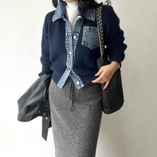 네모엔룩 배색청카라 여성용 데님배색 앞가슴 포켓장식 기본핏 캐주얼 레이어드 자켓형 카라넥 도톰 니트 가디건