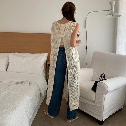 [무드수]울 뜨개 시스루 루즈 백리스 탑