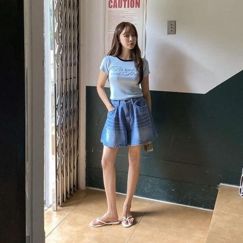 [에이치플러스몰]데님 와이드 밴딩 5부 청 버뮤다 팬츠 반바지