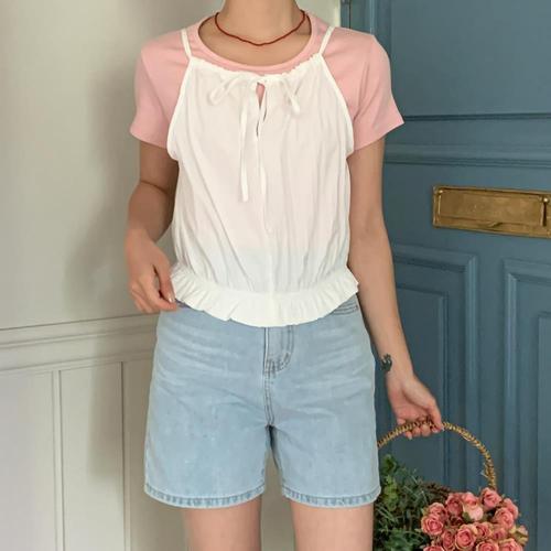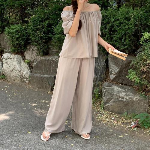 [옷자락]여자 라운드넥 루즈 밴딩 반팔 블라우스 팬츠 세트