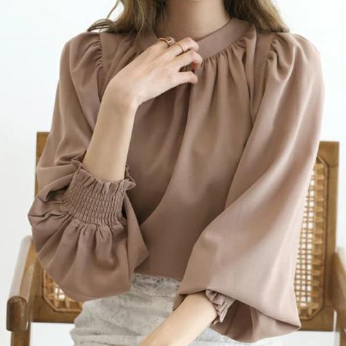 [옷자락]여자 소프트 루즈핏 밴딩 퍼프소매 라운드넥 프릴 블라우스
